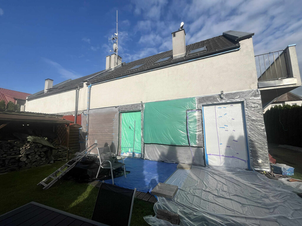 Ogromnie istotne jest także odpowiednie przygotowanie do pracy: warto zwrócić uwagę na warunki panujące za oknem – pogoda powinna być możliwie stała oraz sucha, bez opadów deszczu, śniegu ani gradu, a także bez silnego wiatru. Optymalnie byłoby wykonywać taki zabieg wiosną albo latem, choć oczywiście w chłodniejszych porach roku również będzie to możliwe, z tym że może być nieco bardziej utrudnione. Przed rozpoczęciem malowania konieczne będzie gruntowne oczyszczenie i przygotowanie elewacji – usunięciu zabrudzeń, kurzu, porastających fasadę roślin, mchu, czy innych przedmiotów i elementów, które mogłyby uniemożliwić jednolite i równomierne nakładanie farby.